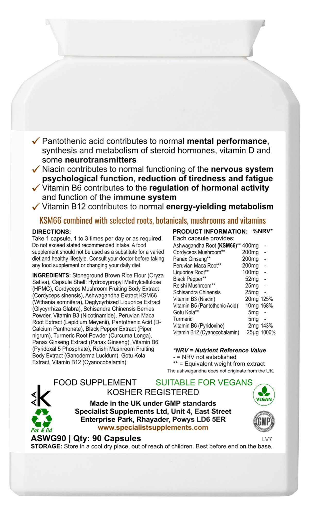 A synergistic formula combining Ashwagandha KSM-66ยฎ root extract with a carefully selected blend of roots, herbs, mushrooms, and B vitamins. Designed to support the nervous system, immune system, energy levels, stress resilience, mental performance, and overall vitality โ all in one convenient capsule.