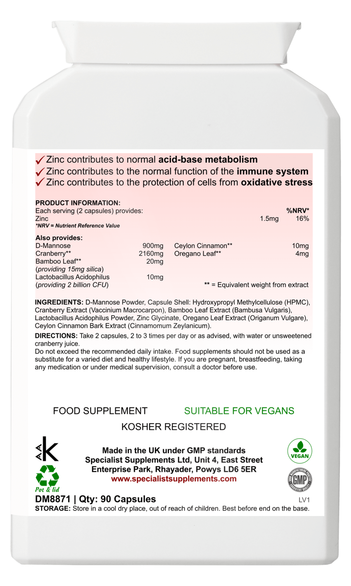 A premium high-strength D-mannose supplement delivering 900mg D-mannose per serving, combined with cranberry extract (2160mg equivalent), Lactobacillus acidophilus live cultures (2 billion CFU), zinc, and carefully selected botanicals – including Ceylon cinnamon, oregano, and bamboo leaf (providing silica).