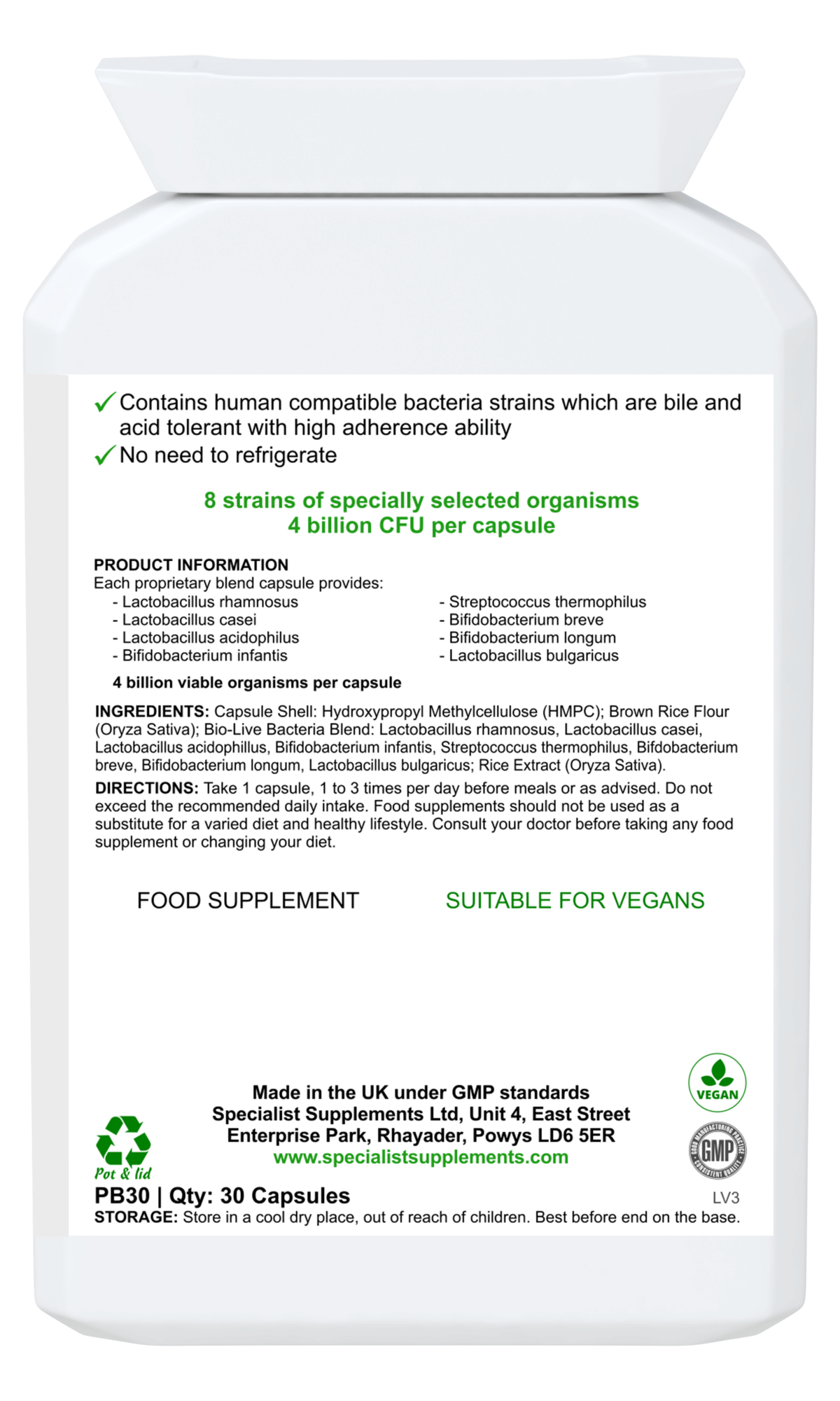 A premium multi-strain probiotic formula, delivering 4 billion live organisms per capsule from 8 carefully selected strains: