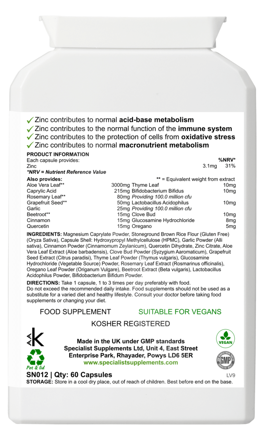 Nutrients: Glucosamine (vegetable source), Quercetin, Zinc